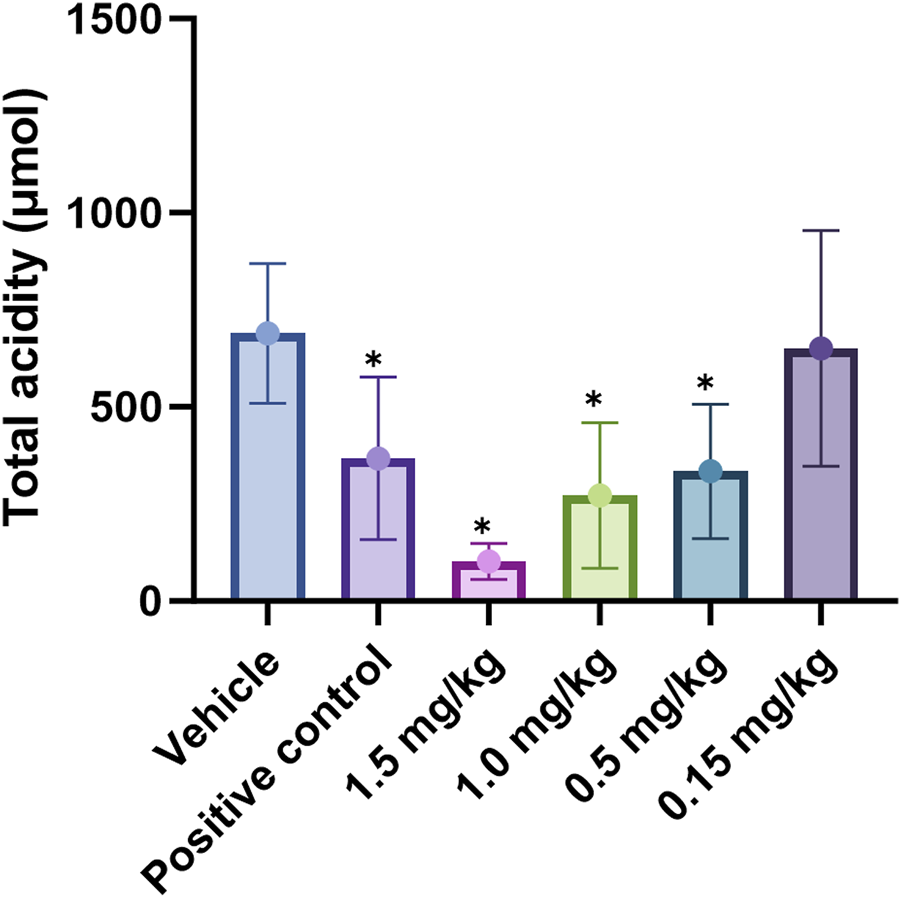 The rats were fasted overnight with ad libitum access to water. Drugs and vehicle were administered orally to rats in a blinded manner. The pylorus was ligated under ether anesthesia within 1 h after drug and vehicle administration, and the abdomen was closed by suturing. At 4 h after pyloric ligation, the rats were sacrificed by CO2 asphyxiation, and the stomach was removed (Hori et al., 2010). The gastric contents were collected and centrifuged at 3,000 rpm for 10 min. The volume of each sample was measured, the gastric acid concentration was determined by acid-base titration, and the total acidity was calculated.