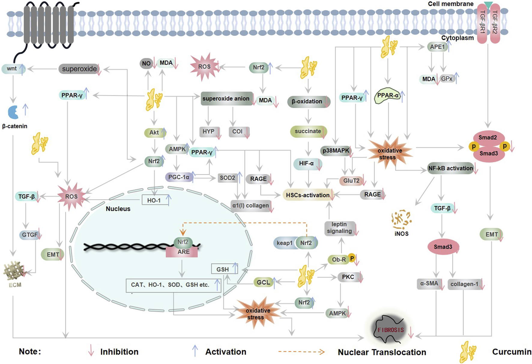 Nitrotyrosine is a product of protein oxidation and is considered a marker of oxidative damage. Curcumin may prevent liver fibrosis through the decrease of nitrotyrosine staining in thioacetamide (TAA) -treated rats (Bruck et al., 2007). Overproduction of ROS oxidizes guanine residues to 8-OHdG, and these adducts can cause DNA damage when added to DNA (Singh et al., 2011). Curcumin significantly diminishes the proportion of 8-OH-dG-immunopositive nuclei, serving as an established biomarker for oxidative stress-induced DNA damage (Vizzutti et al., 2010). Heme oxygenase-1 (HO-1) serves as the primary regulatory enzyme in heme metabolism, exhibiting pronounced antioxidant and anti-inflammatory properties (Yachie, 2021). Curcumin may ameliorate hepatic fibrosis by increasing HO-1 and decreasing oxidative stress in Male Sprague–Dawley rats (Öner-İyidoğan et al., 2014). Apurinic/apyrimidinic endonuclease 1 (APE1) plays a crucial part in the base excision repair (BER) pathway of ROS-induced damaged bases and DNA single-strand breaks and is a key element of proteins upregulated by oxidative stress (Weaver et al., 2022). Curcumin may protect the liver from oxidative stress via upregulating APE1 (Bassiouny et al., 2011). AGEs and RAGE play a pivotal role in NASH- associated hepatic fibrosis (Lohwasser et al., 2009). Curcumin ameliorates oxidative stress-induced effects by suppressing AGEs-induced leptin signaling activation, thereby blocking HSC activation (Tang and Chen, 2014).