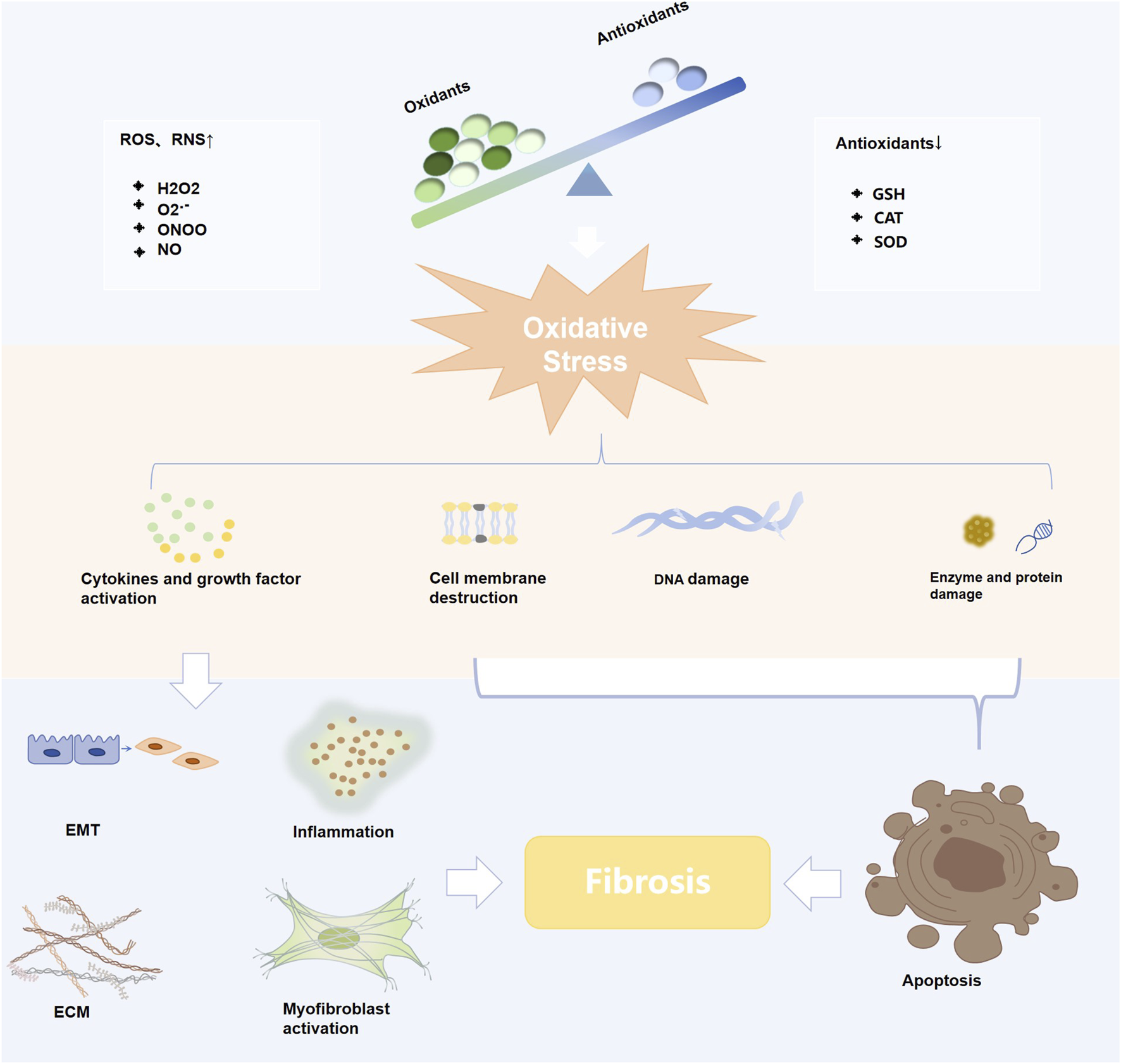 In the pathological mechanism of oxidative stress-induced fibrosis, Oxidative stress drives inflammatory cascades via elevated secretion of proinflammatory cytokines and fibrogenic growth factors, thereby promoting myofibroblast activation and pathological extracellular matrix remodeling. ROS upregulates TGF-β signaling pathways and serve as critical effectors in propagating TGF-β-induced fibrogenic responses, including fibroblast activation, the synthesis of pro-fibrotic mediators, epithelial/endothelial cell apoptosis, and epithelial-mesenchymal transition (EMT) (Liu and Desai, 2015). On the other hand, increased extracellular matrix deposition due to oxidative stress subsequently leads to fibrosis (Jianming and Li, 2016; Makena et al., 2023). In the meanwhile, oxidative stress causes lipid damage to parenchymal cell membranes, disrupts enzyme and protein modifications that are essential for cell metabolism, and promotes DNA mutation, culminating in apoptosis of these cells. In summary, oxidative stress can cause the progress of fibrotic diseases through these damages (Antar et al., 2023) (Figure 2).
