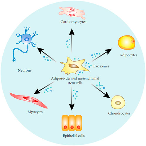 Adipose-derived stem cells(ADSCs) have received widespread attention due to their multifaceted, abundant, and easily isolated characteristics. A large number of studies have demonstrated that ADSCs are promising for a wide range of applications in regenerative medicine. ADSCs are an important stem cell type isolated from adipose tissue with properties of multidirectional differentiation and self-renewal (Deng and Chen, 2022). Increasingly, research is focusing on exosomes derived from adipose-derived stem cells (ADSCs-exos). ADSCs-exos promote tissue regeneration, immunomodulation, angiogenesis, cell migration, proliferation, differentiation, and tissue remodeling by modulating multiple signaling pathways (Li Y. et al., 2023). This paper reviews the current state of research on ADSCs-exos and summarises the application of ADSCs-exos in stem cell-free treatment of diabetes, cardiovascular, wound healing, neurodegenerative, skeletal, respiratory disorders, and skin ageing, thus providing new insights into the clinical application of ADSCs-exos in disease management.