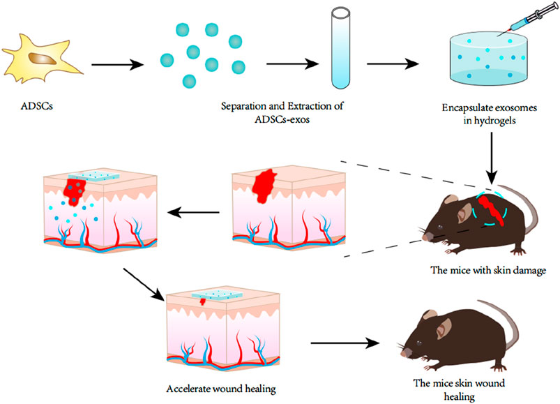 Figure 3. Exosomes were extracted from adipose tissue stem cells and encapsulated in a specific hydrogel, which was then locally applied to a mouse model of refractory skin injury. It was found that this hydrogel encapsulated with exosomes could promote skin wound healing better than the application of exosomes or hydrogel alone.
