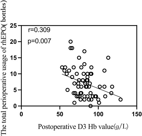 We analyzed the correlations among the patient’s height, weight, body mass index, hemoglobin level at admission, red blood cell count, hematocrit, intraoperative blood loss, total perioperative medication dosage (units), and hemoglobin levels on the first and third days after surgery. The results revealed a negative correlation between the total amount of rhEPO used and the hemoglobin level on the third postoperative day (r = −0.309, p = 0.007). The results are presented in Figure. 3.