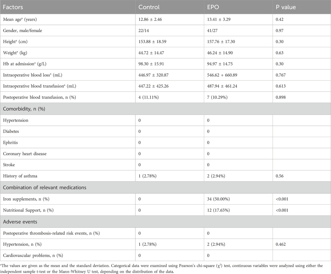 Erythropoietin is an effective drug for the treatment of anemia. The mechanism of action of rhEPO involves stimulating hematopoietic stem cells in the bone marrow, thereby increasing the amounts of raw materials available for hemoglobin synthesis to promote the maturation and release of red blood cells into the bloodstream. In addition, rhEPO can activate the division of primitive red blood cells to promote the proliferation and release of reticulocytes, which ultimately leads to increased levels of hemoglobin, erythrocytes, and reticulocytes in the patient’s body to reduce the number of blood transfusions. Van Iperen C reported that rhEPO levels in the blood were significantly elevated after smajor surgery and peaked on the 5th postoperative day (Van Iperen et al., 1998). Moreover, in a mouse model of cancer, the hemoglobin concentration in the rhEPO-treated group was significantly greater than that in the control group. Currently, researchers can genetically intervene with erythropoietin at the molecular level and better express the gene locus for anemia treatment, suggesting that rhEPO is effective for both surgery and cancer-related anemia (Nguyen et al., 2013; Cao et al., 2020). Although rhEPO has been associated with venous thromboembolism, elevated blood pressure, and adverse cardiovascular events, previous studies have shown that rhEPO does not increase the risk of thrombosis following orthopedic surgery (Ruan et al., 2020). This study confirms that finding, with no significant increase in hypertension or cardiovascular event risk.