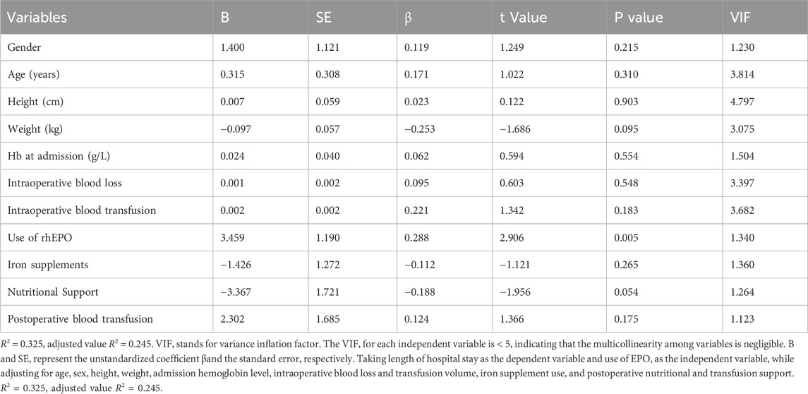 In this study, the length of hospital stay was designated as the dependent variable, with the use of rhEPO being the primary independent variable. Additionally, the model was adjusted for a range of potential confounding factors, including age, gender, height, weight, hemoglobin level at admission, intraoperative blood loss, intraoperative blood transfusion volume, iron supplementation, postoperative nutritional support, and postoperative blood transfusion. Multiple linear regression analysis revealed that the use of rhEPO was significantly positively associated with the length of hospital stay (B = 3.459, SE = 0.200, P = 0.005). Specifically, this result indicates that patients who received rhEPO had a mean length of hospital stay that was 3.459 days longer than that of patients who did not receive rhEPO. Other factors did not have a significant impact on the duration of the hospital stay.