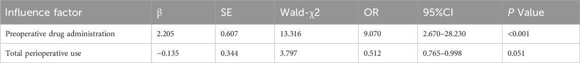 We set a hemoglobin level ≥8 g/dL on the third postoperative day to achieve a therapeutic effect. Among all patients, 38 patients (55.88%) met the criteria, whereas 30 (44.12%) did not. One-way analysis of variance was performed to assess the relationships between patient age, sex, anemia status at admission, preoperative drug administration, intraoperative blood loss, intraoperative blood transfusion, and blood loss/transfusion ratios and postoperative hemoglobin levels on the third postoperative day. In the unifactorial analysis of the therapeutic effect in patients with osteosarcoma with postoperative anemia, only preoperative drug administration was significantly different (OR = 6.75, 95% CI: 2.314 to 19.692, p < 0.001)), whereas the differences in the remaining variables were not statistically significant (P > 0.05; Table 3; Figure 2).