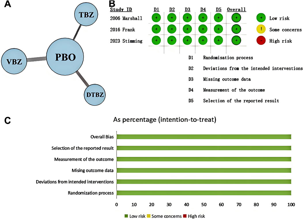 Figure 1. (A) Network plot shows patient counts per treatment arm for outcomes, with line width representing sample size for direct comparisons. (KINECT-HD included two incomplete subjects in safety/tolerability analysis.) (B) Cochrane system bias evaluations for each of the included publications. (C) Risk of bias graph. DTBZ, deutetrabenazine; PBO, placebo; TBZ, tetrabenazine; VBZ, valbenazine.