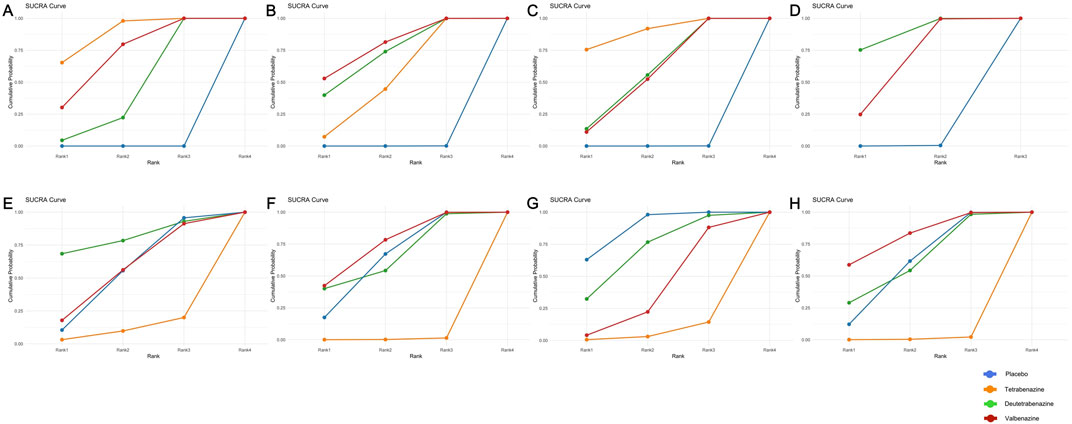 Figure 2. Surface under the cumulative ranking curve of available competing interventions for main outcomes. (A) = UHDRS TMC, (B) = UHDRS Total motor, (C) = CGI-C response, (D) = PGI-C response, (E) = Overall withdrawals, (F) = Withdrawals due to AEs, (G) = AEs, (H) = SAE.