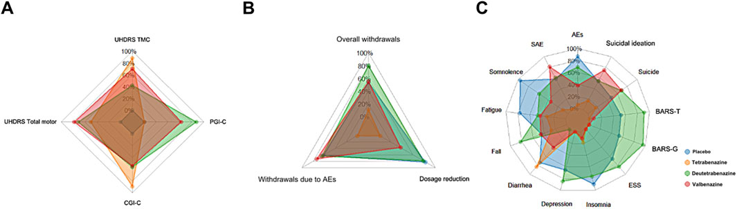 Figure 3. The radar chart for SUCRA values across three types of outcomes. Each color represents a different drug, and each axis label corresponds to a specific outcome. The larger the area covered by the color representing a drug on the radar chart, the more advantageous that drug is for that particular type of outcome. Abbreviations: UHDRS TMC, Unified Huntington’s Disease Rating Scale Total Maximal Chorea; CGI-C, Clinical Global Impression of Change; PGI-C, Patient Global Impression of Change; AEs, adverse events; SAE, Serious adverse events; ESS, Epworth Sleepiness Scale; BARS-G, Barnes Akathisia Scale global score; BARS-T, Barnes Akathisia Scale total score. (A) Efficacy indicators (SUCRA). (B) Tolerance indicators (SUCRA). (C) Safety indicators (SUCRA).