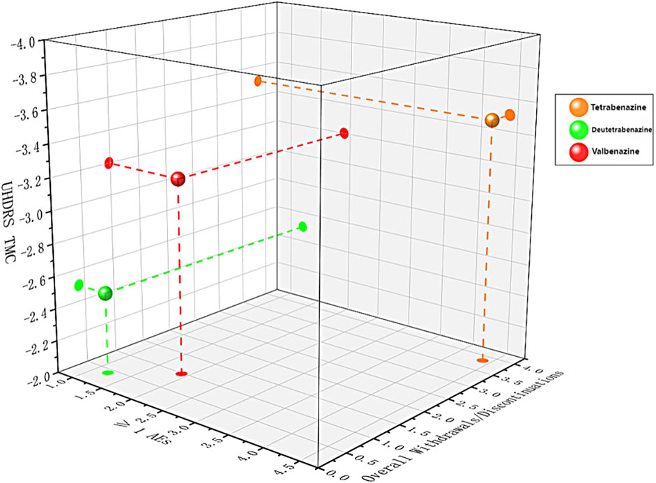 A three-dimensional scatter plot (Figure 4) combining primary efficacy outcomes, overall withdrawals, and ≥1 AEs was also generated. Tetrabenazine appeared higher up, indicating better efficacy; deutetrabenazine was positioned more to the left and closer, reflecting its advantage in safety and tolerability; while valbenazine, located toward the upper left relative to other treatments, demonstrated superior overall performance.
