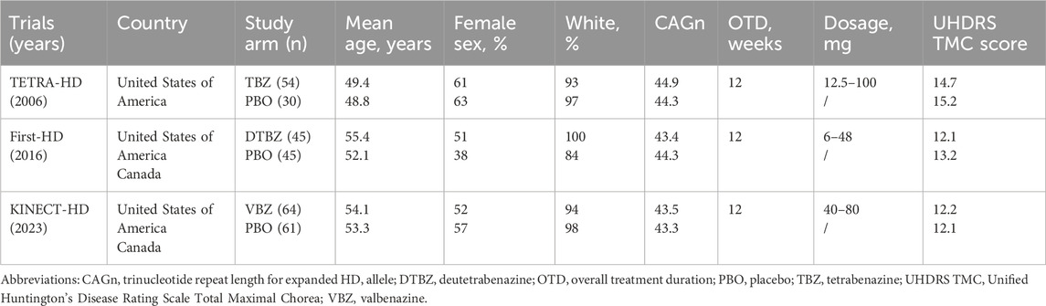 Our search yielded 498 potential literature citations, of which three RCTs met the inclusion criteria (1 tetrabenazine vs. placebo, 1 deutetrabenazine vs. placebo, 1 valbenazine vs. placebo) (Huntington Study Group, 2006; Huntington Study Group et al., 2016; Stimming et al., 2023). And a total of 299 HD patients were included in present NMA (Supplementary Figure S1). Baseline characteristics of participants are summarized in Table 1 [mean age of approximately 52 years and a higher proportion (approximately 60%) of women than men]. Trials were generally well-balanced with respect to patient baseline characteristics and the Cochrane risk of bias assessment for included studies is presented in Supplementary Figure S1.