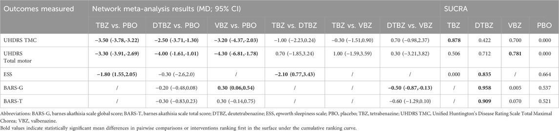 Various intervention measures were compared using Bayesian NMA in accordance with established Bayesian modeling guidelines (Dias et al., 2013). NMA is an analytical approach that synthesizes both direct and indirect evidence, thereby overcoming the constraints of pairwise comparisons and facilitating the simultaneous evaluation of multiple interventions. Bayesian models enable more efficient data integration and yield more reliable ranking outcomes. All Bayesian analyses were executed in R software (version 4.2.3) using the gemtc package, with a Gibbs sampler employed for Markov chain Monte Carlo simulations. The analysis utilized four simulation chains, with 2,0000 adaptation iterations and 50,000 simulation iterations. In cases where the data were particularly sparse, the number of adaptation iterations was increased to 50,000 and simulation iterations to 200,000 to ensure robust model convergence. Additionally, Fisher’s exact test was employed to determine whether observed differences were statistically significant when data sparsity posed challenges for Bayesian estimation. For continuous outcomes, the mean difference (MD) was utilized as the effect measure, with uncertainty quantified using 95% credible intervals (CrIs). For binary outcomes, the odds ratio (OR) and 95% CrI were applied. The Surface Under the Cumulative Ranking Curve (SUCRA) was employed to assess the ranking probabilities of different medications across various outcomes. For reverse-scored outcome measures, a data transformation was applied in the original R code so that higher SUCRA values consistently indicate more favorable results for patients with HD across all efficacy, safety, and tolerability endpoints. In cases where data for a specific treatment group were missing, comparisons were limited to the available drugs and placebo. In the original studies of deutetrabenazine, due to data unavailability, the number of participants experiencing AEs was approximated by the frequency of adverse events, which did not affect the overall conclusions of the AEs.
