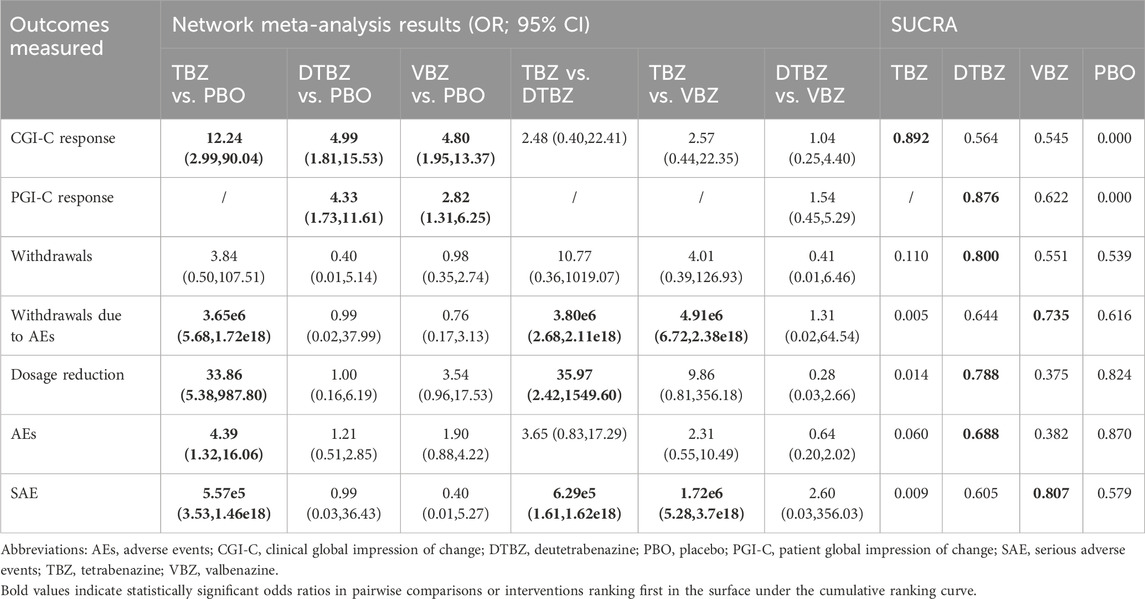 Compared with placebo or with each other, none of the interventions showed a statistically significant effect on the incidence of overall withdrawals. However, tetrabenazine demonstrated a significantly higher incidence of withdrawals due to AEs compared to placebo (OR = 3.65e6, 95% CrI = 5.68 to 1.72e18), deutetrabenazine (OR = 3.80e6, 95% CrI = 2.68 to 2.11e18), and valbenazine (OR = 4.91e6, 95% CrI = 6.72 to 2.38e18) (Table 3). Moreover, tetrabenazine exhibited a greater risk of dosage reduction compared to placebo or deutetrabenazine (OR = 33.86, 95% CrI = 5.38 to 987.80; OR = 35.97, 95% CrI = 2.42–1549.60), though no statistically significant difference was observed versus valbenazine.