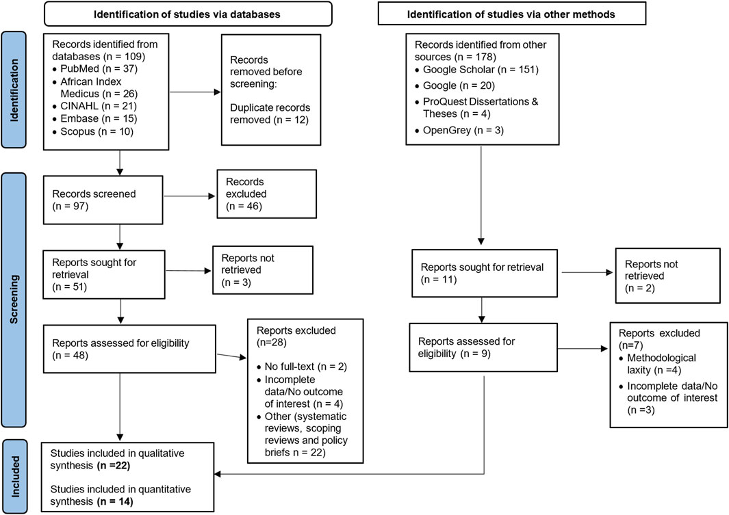 A total of 109 studies were retrieved from various search engines and databases (Figure 1). Of these, 97 remained after removing duplicates. Similarly, about 178 studies were obtained from other sources. After assessing relevance, only 11 studies were retained. Then, 57 studies were evaluated for eligibility. Ultimately, 22 studies were included in the narrative synthesis because they met the criteria of reporting either prevalence data, factors, or indications for the use of HMs. Only 14 studies were included in the meta-analysis, as they provided prevalence data for HMs use consistent with the eligibility criteria, and 8 studies were not included in the final meta-analysis since they did not report the prevalence data (Figure 1).