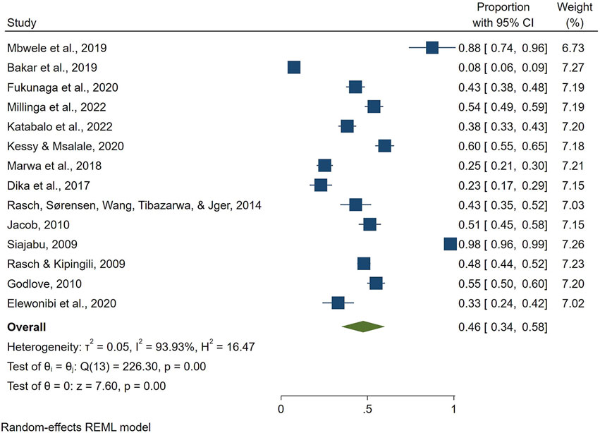 Results: About 22 studies with 5,248 women from 16 administrative regions of Tanzania were included in a narrative synthesis. These studies had a low to moderate risk of bias. Furthermore, fourteen studies (n = 4,817) were included in the meta-analysis. Overall, the average prevalence of herbal medicine use for maternal conditions was 46% [95%, CI: 34–58], I2 = 93.93%]. Similarly, the commonly managed maternal condition was labor induction 69% [95%, CI: 42–96], and its frequency of citation was (38%).