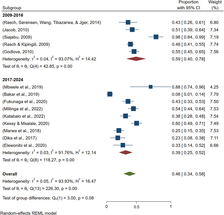 Figure 4. Time-based subgroup meta-analysis on the use of HMs for managing maternal conditions in Tanzania.