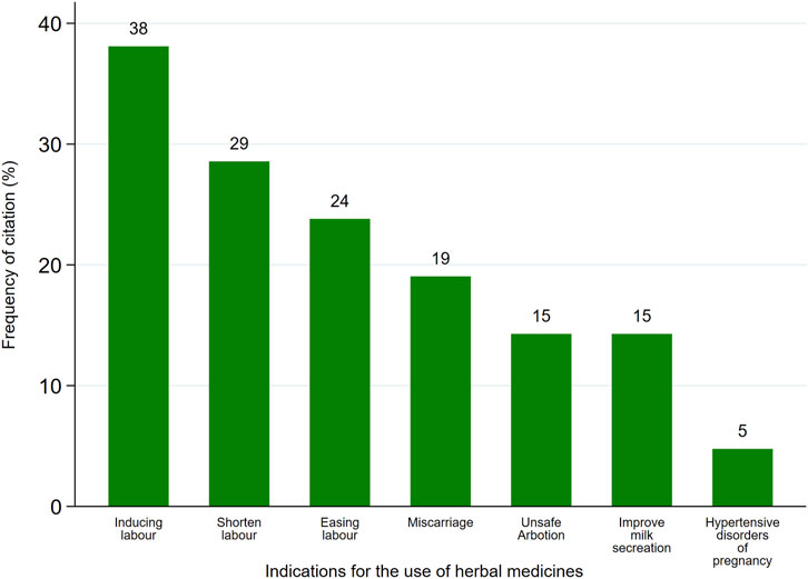 The review revealed that various HMs managed about seven maternal conditions (Table 1). Furthermore, labor induction was the most frequently cited (38%), followed by Shortening of labor duration (29%), while treating hypertensive disorder of pregnancy was the least frequently cited (5%) (Figure 5).