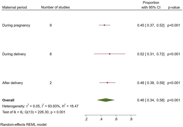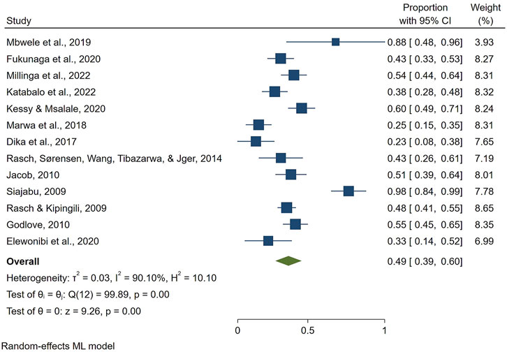The overall prevalence of HMs use for maternal conditions in Tanzania was 46% [95%, CI: 34–58]. The I2 statistic was 93.93%, Q = 226.3, df = 13, P < 0.001, T2: 0.05), indicating considerable heterogeneity among the studies (Figure 2). The condition that was managed the most using HMs was labor induction, 69% [95%, CI: 42–96], followed by improving milk secretion 46% [95%, CI: 24–68] and unsafe abortion 45% [95%, CI: 37–53]. The least reported indication for use of HMs was hypertensive disorders during pregnancy, with a proportion of 25% [95%, CI: 15–35] (Figure 3).