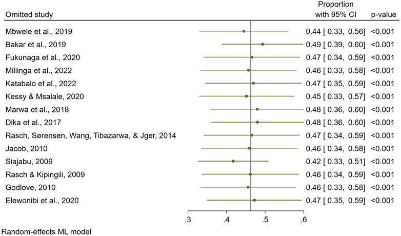 Due to the high heterogeneity of the results, we performed a sensitivity analysis. The exclusion of the study by Bakar et al. (2019) reduced the heterogeneity (I2 = 90.10%, Q = 99.89, df = 12, P < 0.001, T2: 0.03), resulting in a slight increase in the overall prevalence for HMs use to 49% [95% CI: 38–60] (Figure 7).