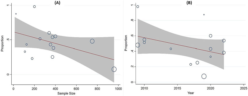 Figure 10. Meta-regression analysis of the prevalence of HMs use against (A) sample size and (B) year of publication, respectively.