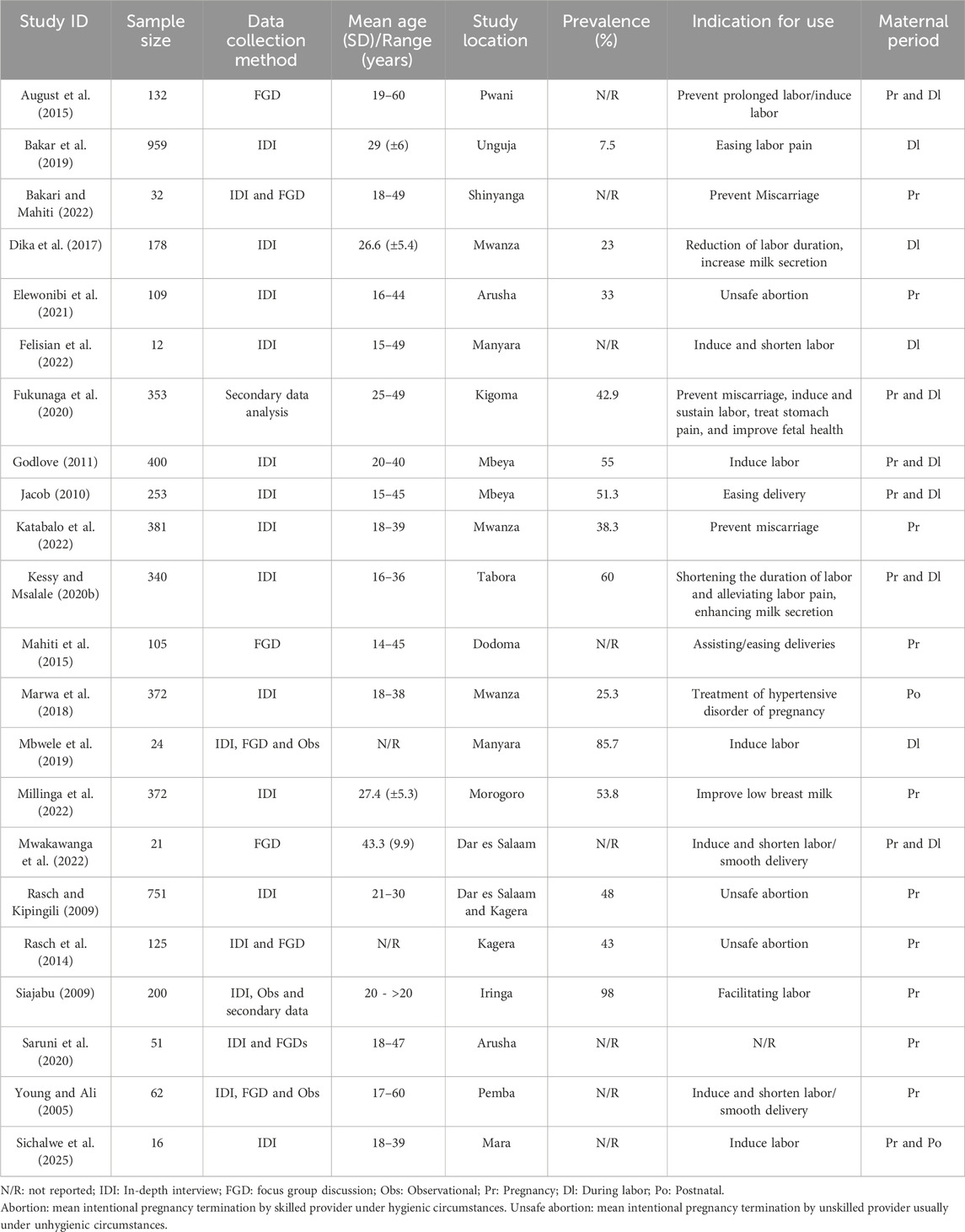 The use of HMs among women for maternal conditions is linked to several factors, such as social status, ethnicity, and cultural traditions. Moreover, the extent of use for the wellbeing of either the mother or the unborn child varies across regions (Illamola et al., 2020). Furthermore, previous studies reported that prevention of incidents of nausea and vomiting, improving abdominal muscle tone and building stamina during labor and delivery, improving the health of the woman, ensuring positive pregnancy outcomes, and easing labor are among the determinants of HMs use (Attah et al., 2012; Felisian et al., 2022; Shewamene et al., 2017). Although studies indicated that the majority of women use HMs for various healthcare needs, there is no accurate national estimate on the prevalence of HMs use for maternal conditions among women in Tanzania. Therefore, we conducted this systematic review to answer the following research questions: (1) what is the average prevalence of HMs use for maternal conditions in Tanzania? (2) what are the major maternal conditions commonly managed by HMs among Tanzanian women? The findings of this review enhanced awareness of the extent to which women of reproductive age use HMs. Bridging this knowledge gap could potentially influence reproductive and child health programs to account for traditional medicine use while planning for interventions to improve maternal health. The improved maternal care outcomes in the form of identifying and addressing potential risks for HMs-conventional medicine interaction could contribute towards accelerating maternal mortality reduction. This reduction is critical in achieving SDG targets.