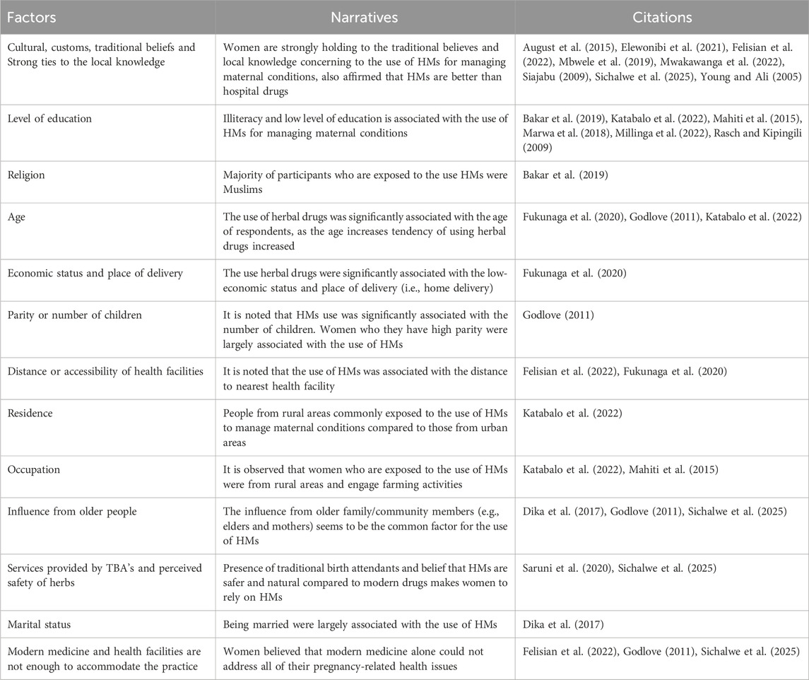 The narrative analysis method was used to summarize factors of HMs use among women for managing maternal conditions. The included studies were grouped based on factors influencing the use of HMs. The grouping was also based on the direction of influence. For each group, a narrative description was given (Rodgers et al., 2009). The direction of influence was determined by interpreting the context and language provided in the included studies. Specifically, factors were categorized as either promoting the use of HMs or not based on how they were described in the original study narratives. For example, when a study reported that “women are strongly holding to the traditional beliefs and local knowledge concerning the use of HMs for managing maternal conditions, and also affirmed that HMs are better than hospital drugs,” this was classified as a factor promoting HMs use, since the description reflected a positive inclination toward traditional practices over biomedical care.