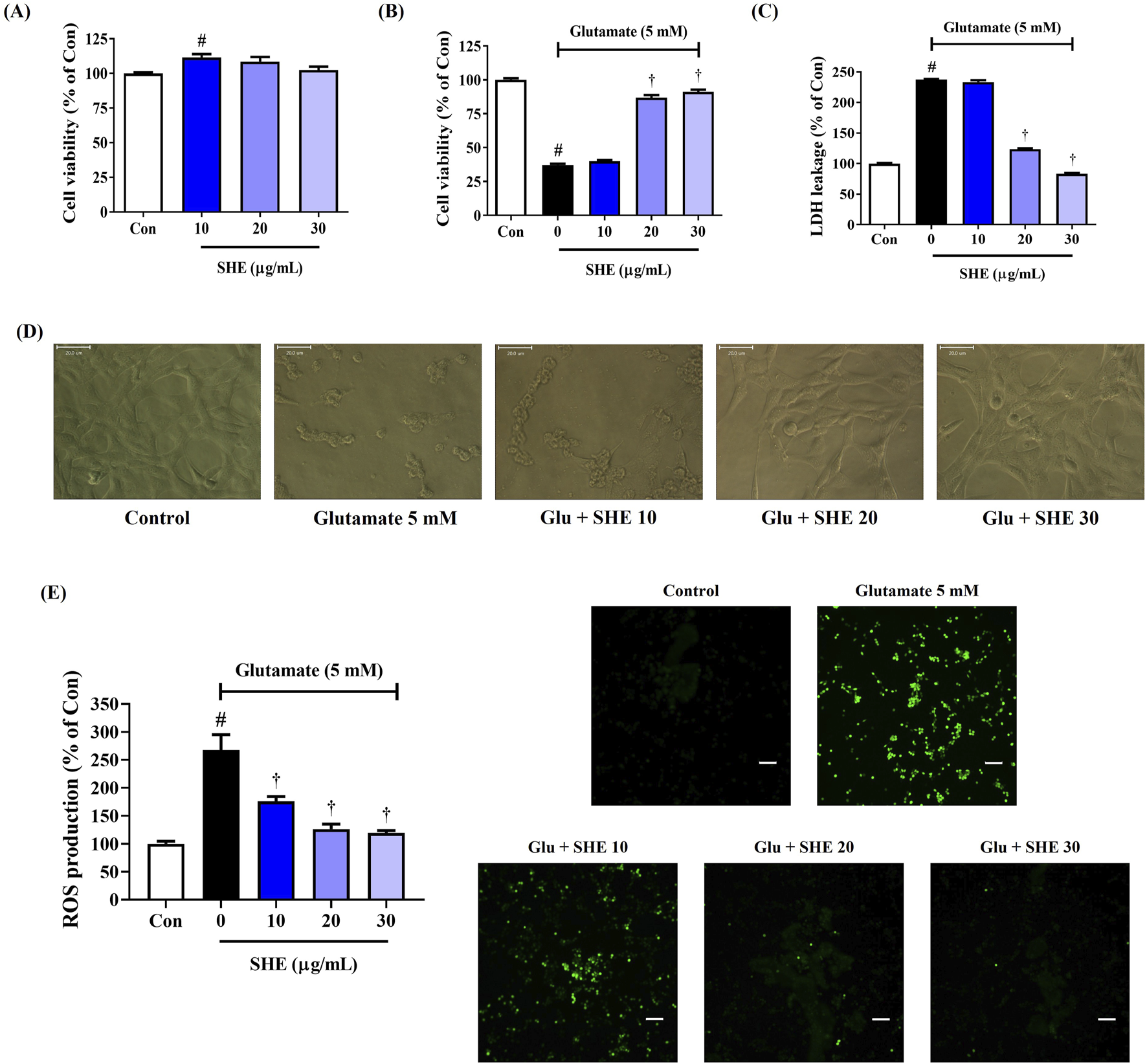 Effects of Spirodelae Herba ethanol extract (SHE) on glutamate-induced (A–D) cytotoxicity and (E) intracellular reactive oxygen species (ROS) production in HT22 cells. Control cells were incubated with the vehicle alone. All experiments were repeated at least three times, and similar results were obtained. (A–C, E) Data are expressed as the mean ± standard error of the mean of six independent experiments. (D) Scale bar = 20 μm. (E) Scale bar = 200 μm. Con, control; LDH, lactate dehydrogenase; Glu, glutamate. #p < 0.05 (vs. control) and †p < 0.001 (vs. glutamate).