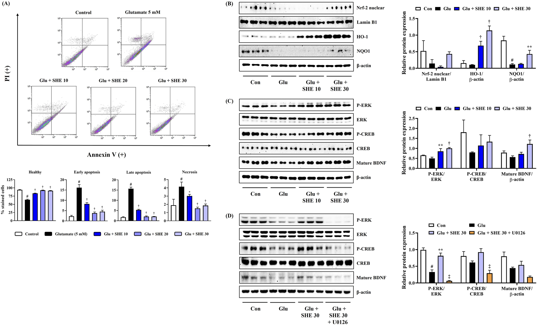 To explore the activity of SHE on neuronal apoptosis exposed by glutamate treatment, flow cytometric analysis was performed using annexin V–PI double staining on damaged cells. Flow cytometry revealed that glutamate exposure for 24 h notably increased the apoptosis of HT22 cells. However, SHE pretreatment significantly attenuated glutamate-treated neuronal cell death concentration-dependently, and treatment at 30 μg/mL concentration maintained cell numbers similar to that of the non-treated control (Figure 2A).