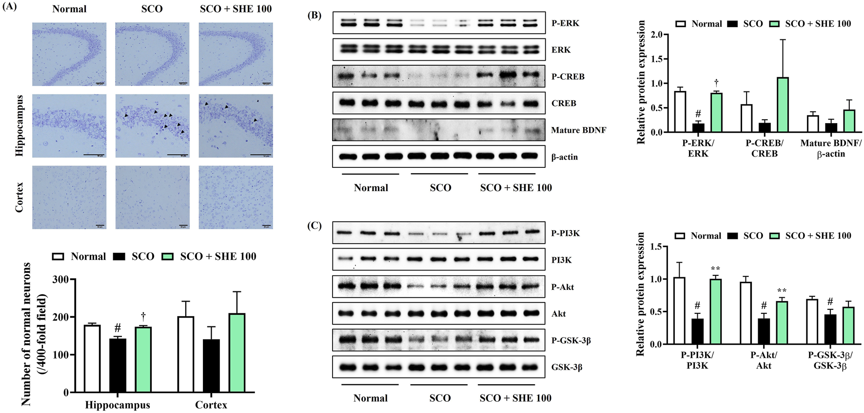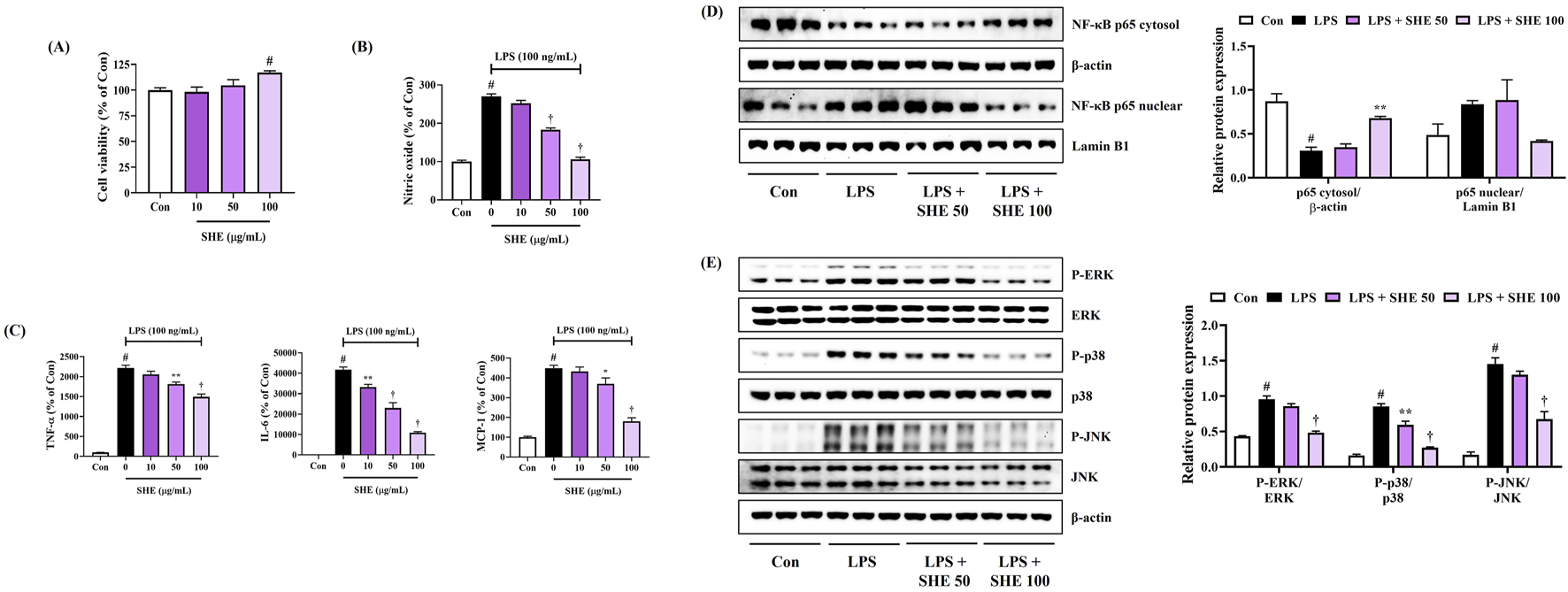 The data values are expressed as the means with standard error of the mean from at least three independent replicate experiments. Statistical significance was measured through one-way analysis of variance and verified using Dunnett’s test after comparing SCO, glutamate, or LPS vs. each treated group. Statistical significance was determined as #p < 0.05 (vs. normal or control); *p < 0.05, **p < 0.01, and †p < 0.001 (vs. SCO, glutamate, or LPS); and ‡p < 0.05 (vs. glutamate + SHE 30).