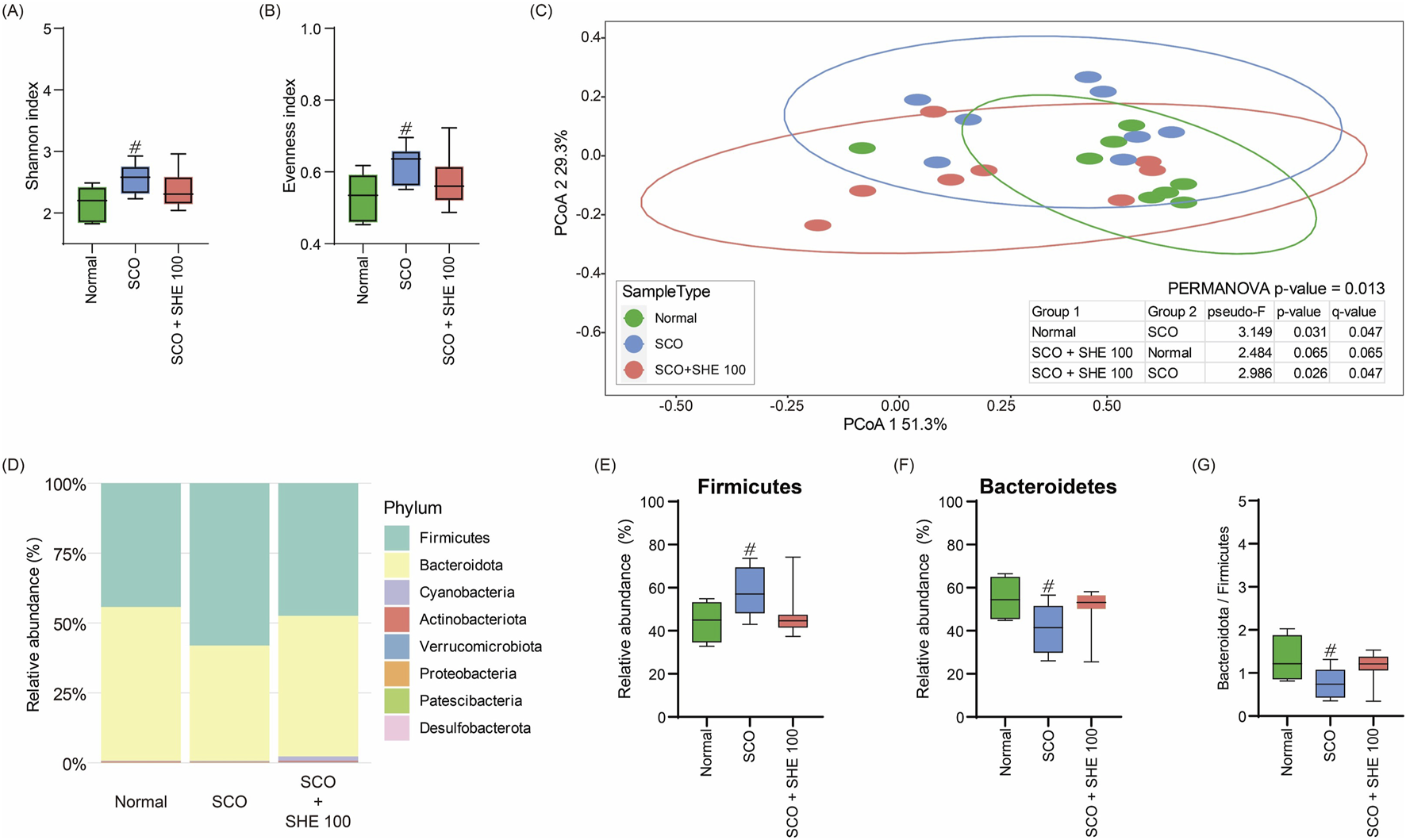 Fresh fecal samples were collected from all the mice in each group, and the collected samples were placed in sterile tubes, immediately frozen in liquid nitrogen, and stored at −80 °C. DNA from each sample was extracted using the QIAamp PowerFecal DNA Isolation Kit (Qiagen), and the quality of the extracted DNA was assessed by electrophoresis and quantified using a Qubit 2.0 Fluorometer (Life Technologies, Carlsbad, CA, United States). 16S rRNA gene sequencing was then performed using the Illumina MiSeq platform at the KNU NGS Core Facility (Kyungpook National University, Daegu, Korea). Data were analyzed by QIIME 2 (version 2022.2) using DADA2 software (Bolyen et al., 2019; Callahan et al., 2016). The taxonomic classification of the representative sequences was determined through taxonomy using the q2-feature-classifier (sklearn) against the Greengenes database (version 13.8) (DeSantis et al., 2006; Pedregosa et al., 2011). Phylogenetic trees, both rooted and unrooted, were generated using the MAFFT, mask, and FastTree protocols (Katoh and Standley, 2013; Price et al., 2010). These trees were subsequently used for diversity analysis. The smallest sample contained 37,376 features. Further analyses were performed using the phyloseq (version 1.32.0) and vegan (version 2.5-6) R packages (McMurdie and Holmes, 2013).