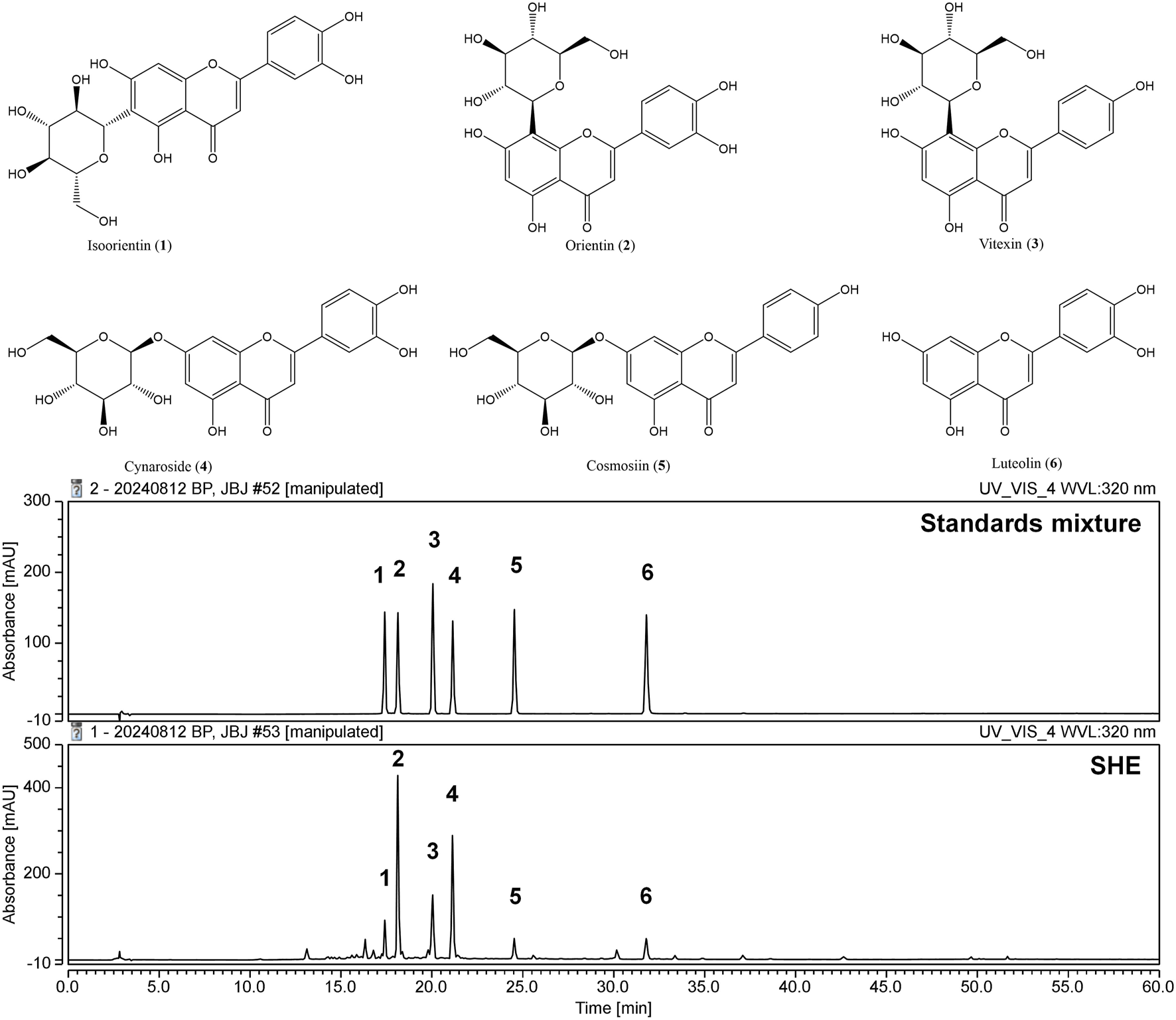 All standard solutions contained methanol as the solvent to dissolve the compounds. Initially, standard stock solutions with 100 μg/mL concentration were prepared, followed by serial dilution with methanol to create a range of concentrations for the calibration curve. The SHE sample solution was prepared at 20 mg/mL concentration in methanol. Prior to analysis, all solutions were filtered using 0.45-μm regenerated cellulose membrane syringe filters (Sartorius, Germany). Table 2 details the compounds used for HPLC analysis.