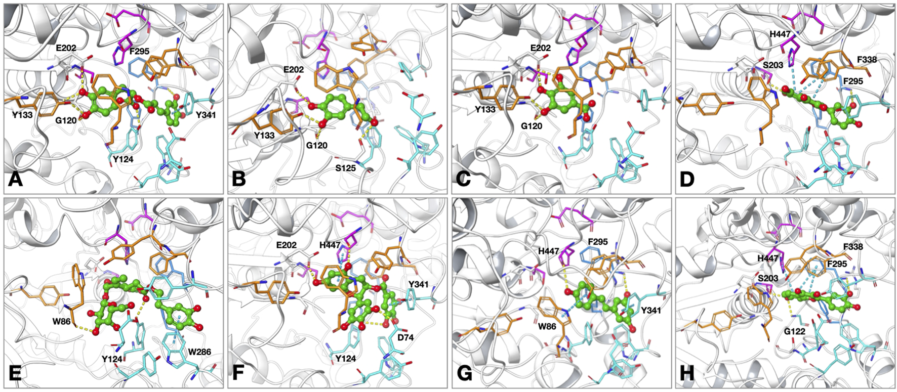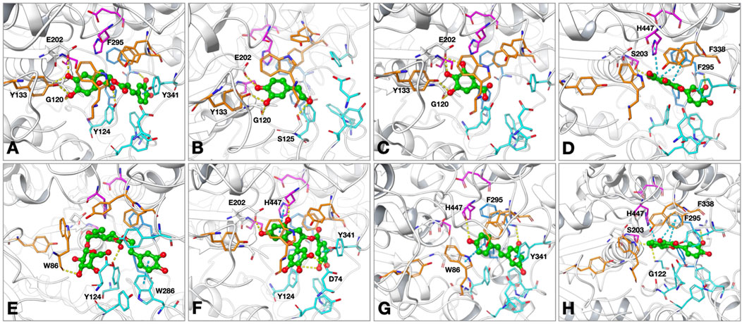 Figure 1. Proposed binding modes of (A) rosmarinic acid; (B) 3-hydroxytyrosol; (C) gallic acid; (D) quercetin; (E) oleuropein; (F) epigallocatechin gallate (EGCG); (G) resveratrol; (H) fisetin at the active site of human acetylcholinesterase (hAChE; PDB: 4EY7). The compounds are presented as green ball and stick models. The residues are colored as follows: catalytic triad: magenta, oxyanion hole: orange, acyl binding site: blue, peripheral anionic site: cyan. The hydrogen bonds and π–π interactions are shown by yellow and cyan dashed lines, respectively.