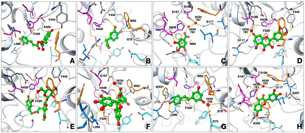 Figure 2. Proposed binding modes of (A) rosmarinic acid; (B) 3-hydroxytyrosol; (C) gallic acid; (D) quercetin; (E) oleuropein; (F) EGCG; (G) resveratrol; (H) fisetin at the active site of human butyrylcholinesterase (hBChE; PDB: 4TPK). The compounds are presented as green ball and stick models. The residues are colored as follows: catalytic triad: magenta, oxyanion hole: orange, acyl binding site: blue, peripheral anionic site: cyan. The hydrogen bonds and π–π interactions are shown by yellow and cyan dashed lines, respectively.