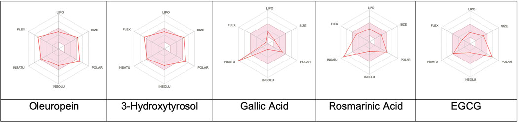 The optimal oral bioavailability for a drug candidate is influenced by a set of interrelated physicochemical parameters that define its favorable chemical space; these include lipophilicity (XLOGP3 between −0.7 and +5.0), molecular weight (150–500 g/mol), TPSA (20–130 Å2), aqueous solubility (log S of 6 to 0), molecular saturation (csp3 fraction of 0.25–1), and limited molecular flexibility (0–9 rotatable bonds). Together, these parameters support a balance between solubility, permeability, metabolic stability, and binding efficiency, thereby optimizing the likelihood of oral bioavailability (Lipinski et al., 2012). The SARs across the series further illustrate how deviations from the optimal physicochemical window translate to distinct pharmacokinetic profiles. Oleuropein violates multiple criteria simultaneously, namely molecular weight, polar surface area, and hydrogen-bonding capacity, resulting in poor drug-likeness and limited absorption. EGCG shares a similar liability owing to excessive polarity and hydrogen-bond donors. Conversely, 3-hydroxytyrosol and gallic acid fit well within the recommended absorption window, highlighting how small sizes and balanced polarity strongly favor bioavailability. Rosmarinic acid demonstrates a borderline profile; although its TPSA approaches the upper limit, the moderate lipophilicity compensates to maintain adequate absorption. Collectively, these trends emphasize the central roles of polarity, flexibility, and molecular size in shaping the absorption potential and reinforce the predictive power of in silico ADME models when interpreted in the SAR framework. While the Lipinski’s Rule of Five remains a cornerstone for evaluating oral drug-likeness (molecular weight < 500 g/mol, MLOGP < 4.15, hydrogen bond acceptors ≤10, hydrogen bond donors ≤5), natural products often fall outside these bounds yet retain their bioactivities and therapeutic relevance (Grabowski et al., 2008).