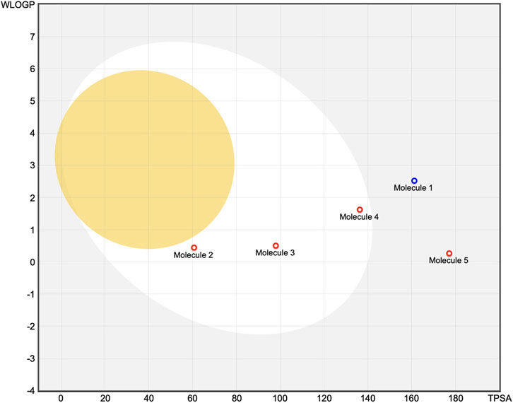 Figure 4. Molecules located in the BOILED-Egg yolk area (orange) are predicted to passively permeate through the blood–brain barrier. Molecules located in the white area are predicted to be passively absorbed by the gastrointestinal (GI) tract. Molecules located in the light-blue background area are neither absorbed by the GI tract nor cross the blood–brain barrier. The red dots are molecules predicted to not be effluxed from the central nervous system by P-glycoprotein. Molecule 1: oleuropein, Molecule 2: 3-hydroxytyrosol, Molecule 3: gallic acid, Molecule 4: rosmarinic acid, Molecule 5: EGCG.