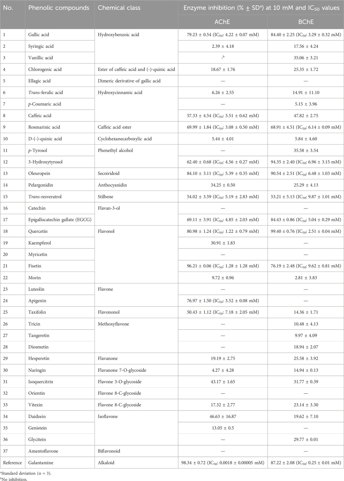 Table 1. AChE and BChE inhibitory effects (inhibition% ± SD) as well as IC50 values of the tested phenolics.