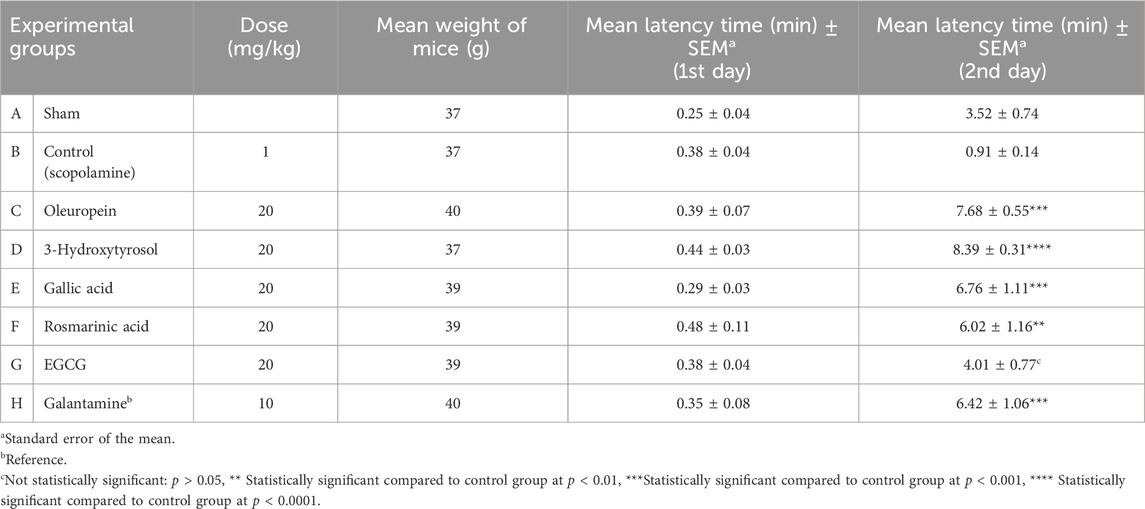 To determine the antiamnesic activities of the compounds, we selected oleuropein, rosmarinic acid, gallic acid, EGCG, and 3-hydroxytyrosol for their dual ChE inhibition owing to their adequate quantities and conducted further evaluations using the passive avoidance test in mice as the prominent in vivo experimental model for memory deficit (Hornedo-Ortega et al., 2018). Here again, the animals were divided into eight groups (n = 8 per group) as follows: A: 0.9% NaCl (sham), B: scopolamine (control), C: oleuropein, D: 3-hydroxytyrosol, E: gallic acid, F: rosmarinic acid, G: EGCG, and H: galantamine (reference). During the acquisition period, the mice were first placed in the light compartment, followed by opening of the guillotine door 10 s later, and measurement of their transition times to the dark compartment using a digital timer (Table 2). After entering the dark compartment, the guillotine door was closed, and the mouse was retained on its feet for 3 s. Then, an electric current of 0.1 mA/10 g of body weight was applied throughout. Immediately after the learning period, only 0.9% NaCl was given to group A (sham) while groups B–G were administered the respective drugs through the i.p. route; to the animals in the H group, the reference drug galantamine was applied via s.c. injection at a dose of 10 mg/kg (Jang et al., 2008). After 30 min, scopolamine (1 mg/kg) was dissolved in 0.9% NaCl and administered by i.p. injection to groups B–G to induce amnesia. Twenty-four hours after the application, the mice were placed back in the light compartment, and their latency times were measured after opening the guillotine door. It was concluded that the mice that did not enter the dark compartment within 9 min (cutoff time) remembered the passive avoidance action. Our findings indicate that the aforementioned five phenolic compounds are effective in mice, with 3-hydroxytyrosol displaying the strongest antiamnesic effect.