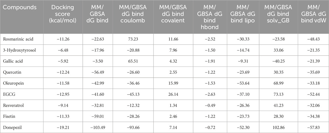 To further validate the docking results, MM/GBSA binding free energy calculations were performed for all docked complexes using Prime from the Schrödinger suite. The calculated ΔGbind values generally supported the docking-derived rankings. For AChE, donepezil (cocrystallized ligand, PDB: 4EY7) displayed the most favorable binding free energy of −103.49 kcal/mol. Among the phenolics, EGCG (−95.42 kcal/mol), fisetin (−59.01 kcal/mol), and quercetin (−56.49 kcal/mol) exhibited highly favorable binding energies, whereas gallic acid (−3.50 kcal/mol) and 3-hydroxytyrosol (−17.96 kcal/mol) showed comparatively weaker stabilization (Table 3). For BChE, the cocrystallized ligand 3FP (PDB: 4TPK) had a ΔGbind value of −86.11 kcal/mol, similar to oleuropein (−83.89 kcal/mol) and EGCG (−75.68 kcal/mol); in contrast, gallic acid (−2.51 kcal/mol) and 3-hydroxytyrosol (−27.68 kcal/mol) exhibited notably weaker binding energies (Table 4). These data validate the docking results and quantitatively position the phenolic compounds relative to donepezil in AChE and with respect to the reference ligand in BChE.