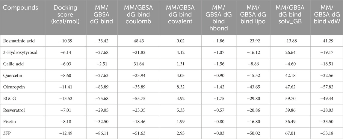 The difference in GBSA solvation energies between the complex and the sum of ligands and proteins is denoted by ΔGsolv. Furthermore, ΔGSA is the difference in the surface area energies between the complex and the sum of proteins and ligands. A script was used to calculate the average MM/GBSA binding energy, which also generates the Coulomb energy (Coulomb), covalent binding energy (Covalent), hydrogen-bonding energy (H-bond), lipophilic energy (Lipo), generalized Born electrostatic solvation energy (Solv_GB), and vdW energy.