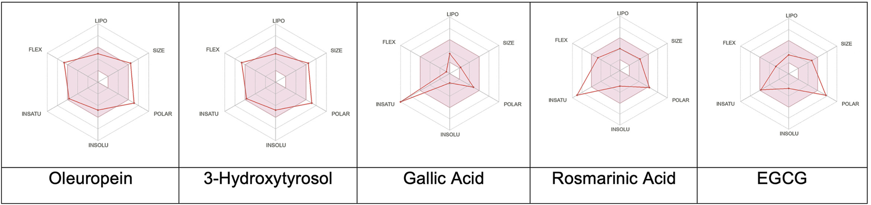 The evaluations of the five selected phenolic compounds reveal various levels of compliance with the drug-likeness criteria (Figure 3). Oleuropein violates Lipinski’s rule in two respects by exceeding both the molecular weight and allowed number of hydrogen bond acceptors; it also fails the Ghose, Veber, Egan, and Muegge filters, primarily owing to its size and high polarity/TPSA. Consequently, a low oral bioavailability score (0.17) is assigned to oleuropein, indicating its limited drug-likeness and significant formulation challenges. In contrast, 3-hydroxytyrosol adheres to all of the Lipinski criteria. Despite its small molecular size violating the Ghose and Muegge rules, it achieves a moderate bioavailability score (0.55). However, the presence of a catechol moiety resulted in one PAINS alert (catechol_A) and one Brenk alert (catechol), indicating potential assay interference or reactivity. Gallic acid exhibited a nearly identical profile as that of 3-hydroxytyrosol, fully complying with Lipinski’s rule and receiving a bioavailability score of 0.56. Similar to 3-hydroxytyrosol, it triggered the same PAINS and Brenk alerts, reflecting similar structural concerns. Rosmarinic acid demonstrated broader compliance by passing the Lipinski, Ghose, Veber, and Muegge criteria and violating only Egan’s rule owing to the TPSA exceeding the optimal range slightly; despite these minor deviations, its bioavailability score was also 0.56. However, multiple structural alerts were identified, including catechol_A (PAINS) and catechol, hydroquinone, and michael_acceptor_1 (Brenk), suggesting a higher probability of chemical reactivity or toxicity. EGCG violated one Lipinski criterion (hydrogen bond donors > 5) and failed the Veber, Egan, and Muegge rules owing to its high TPSA and hydrogen-bonding capacity; despite these, it received a comparable bioavailability score (0.55). EGCG also exhibited the same PAINS and Brenk alerts (catechol-based) observed in the other polyphenolic compounds screened herein.