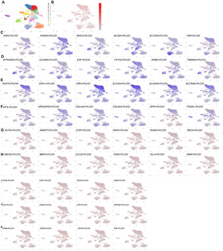 Figure 2. Single-cell analysis of PLCG1 expression levels in renal cells of the DN model. Single-cell sequencing data for PLCG1 expression (A,B). Distal tubule cells (AQP2/KCNJ16/RHCG/SLC8A1/SLC12A3/VDR (C)), intercalated cells (ATP6V0D2/CLCNKA/EGF/FXYD2/RHBG/TMEM213 (D)), proximal tubule cells (AGXT2/CRYL1/LRP2/SLC4A4/SLC5A12/SLC16A9 (E)), podocytes (AIF1L/ARHGAP24/COL4A3/COL4A4/DPP4/PODXL (F)), mesangial cells (ACTA2/ANGPT2/CCR7/HOPX/RASD1/SNCG (G), endothelial cells (ABCG2/BMP2/CCL23/CD93/DLL4/ESM1 (H), B cells (CD22/CD27/CD40/CD86 (I)), T cells (CD4/CD8A/IL7R/TNFRSF4 (J)), and macrophage cells (CD68/CD80/CD163/TNF (K)) in DN patients.