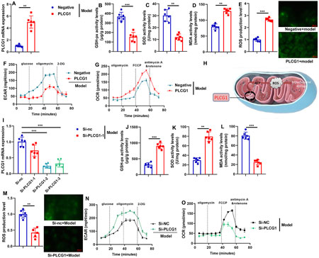 Figure 5. PLCG1 mRNA expression levels (A), GSH-PX, SOD, MDA and ROS activity levels (B–E), ECAR levels (F), OCR levels (G) in vitro model by PLCG1 plasmid; Experimental Description (H), PLCG1 mRNA expression levels (I), GSH-PX, SOD, MDA and ROS activity levels (J–M), ECAR levels (N), OCR levels (O) in vitro model by si-PLCG1 plasmid; **, P < 0.01; ***, P < 0.001.