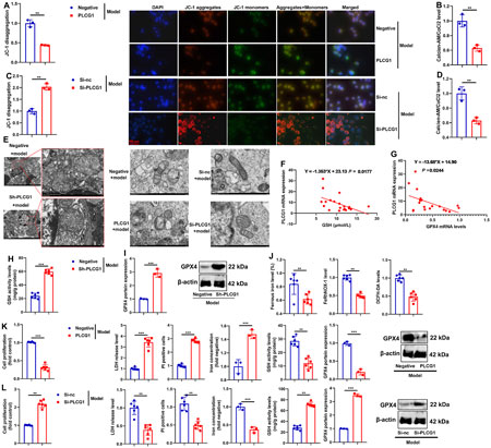 Figure 6. PLCG1 increased mitochondria-dependent ferroptosis in the DN model JC-1 levels (A) and calcein-AM/CoCl2 levels (B) in an in vitro model by PLCG1 plasmid; JC-1 levels (C) and calcein-AM/CoCl2 levels (D) in an in vitro model by si-PLCG1 plasmid; mitochondrial fragmentation (E) in kidney tissue of DN mice in an in vitro model by PLCG1 plasmid and in an in vitro model by si-PLCG1 plasmid; serum PLCG1 mRNA expression in DN patients correlated with inhibition of GSH activity levels and GPX4 mRNA expression (F,G); GSH activity levels (H) and GPX4 protein expression (I), and ferrous iron level/FeRhNOX-1/DCFH-DA (J) in kidney tissue of DN mice; cell growth, LDH activity, PI-positive levels, iron concentration levels, GSH activity levels, and GPX4 protein expression in high glucose-induced NRK-52E cells by PLCG1 plasmid (βK); cell growth, LDH activity, PI-positive levels, and iron concentration levels, GSH activity levels and GPX4 protein expression in high glucose-induced NRK-52E cells by si-PLCG1 plasmid (L). **, P < 0.01; ***, P < 0.001.