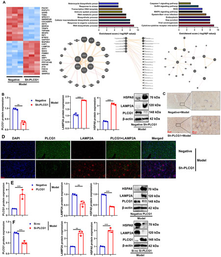 Figure 7. PLCG1 induced LAMP2A/HSPA8 in the DN model heat map (A), PLCG1/LAMP2A/HSPA8 protein expression (B), LAMP2A expression (C), PLCG1+ LAMP2A expression (D) in kidney tissue of DN mice; PLCG1/LAMP2A/HSPA8 protein expression (E) in high glucose-induced NRK-52E cells by PLCG1 plasmid; PLCG1/LAMP2A/HSPA8 protein expression (F) in high glucose-induced NRK-52E cells by si-PLCG1 plasmid; **, P < 0.01; ***, P < 0.001.