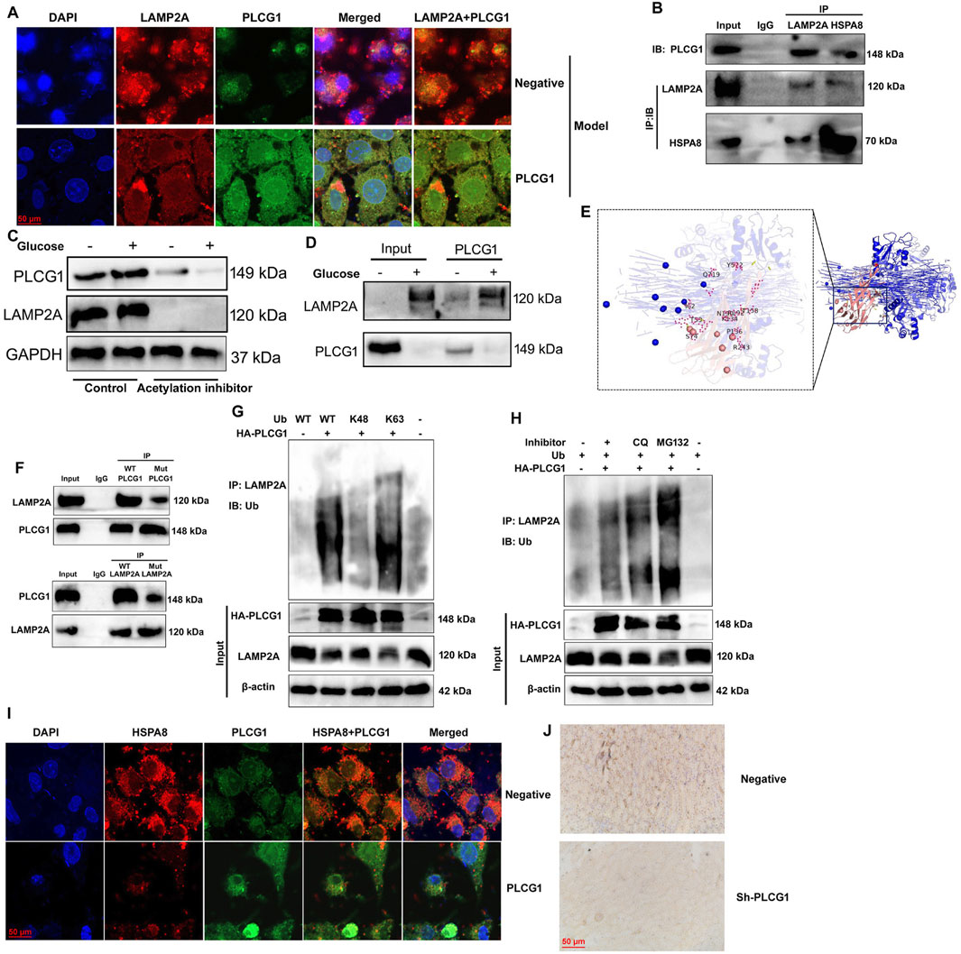 Structural analysis through 3D modeling predicted direct interaction between LAMP2A and PLCG1 proteins (Figure 8E), which was functionally confirmed by IP studies showing wild-type LAMP2A binds wild-type PLCG1, but not mutant PLCG1, while the LAMP2A mutant fails to interact with wild-type PLCG1 (Figure 8F). Importantly, PLCG1 upregulation promoted ubiquitination of LAMP2A, specifically through K48-linked ubiquitination, under high-glucose conditions (Figures 8G,H). Then, immunofluorescence showed that PLCG1 upregulation suppressed HSPA8 expression in an in vitro DN model (Figure 8I). Immunohistochemistry also reported that sh-PLCG1 induced HSPA8 expression in the kidney tissue of DN mice (Figure 8J). These findings collectively demonstrate that PLCG1 interacts with LAMP2A to promote its ubiquitination in DN.