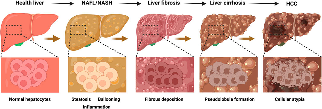 NAFLD, the most common chronic liver disease globally and a leading cause of liver-related complications and mortality (Teng et al., 2023), is defined by hepatic steatosis ≥5% (confirmed by imaging or histology) after excluding secondary causes such as alcohol, drugs, or viral hepatitis (Chalasani et al., 2012). While elevated liver enzymes (ALT or AST) may be present, they are not diagnostic prerequisites (Chalasani et al., 2012). NAFLD manifests as two distinct subtypes: NAFL, characterized by isolated steatosis (≥5%) without significant inflammation or hepatocellular damage (Brunt et al., 2021), and NASH, a progressive form marked by lobular inflammation, hepatocyte ballooning, and fibrosis, which can progress to severe fibrosis, cirrhosis, or HCC (Brunt et al., 2021) (Figure 1).