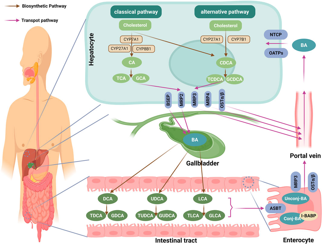 Figure 2. Biosynthesis and enterohepatic circulation of BAs. This diagram encapsulates the intricate pathway of BA metabolism, highlighting key steps from synthesis to circulation. BAs are synthesized from cholesterol in hepatocytes via two pathways: the classical (neutral) pathway, initiated by the rate-limiting enzyme CYP7A1, and the alternative (acidic) pathway, initiated by CYP27A1. Both pathways converge to produce the primary BAs, CA and CDCA, which are then conjugated with taurine (form TCA and TCDCA) or glycine (form GCA and GCDCA). These conjugated BAs are actively secreted into bile canaliculi primarily by the BSEP, with multidrug MRP2 facilitating the excretion of organic anions and sulfated BAs. In cholestatic conditions, hepatocytes utilize basolateral transporters like OSTα/β, MRP3, and MRP4 to redirect BAs into the systemic circulation, circumventing biliary obstruction. Following storage in the gallbladder, they are released postprandially into the duodenum to aid lipid absorption. In the intestine, the vast majority (∼95%) of BAs are reabsorbed in the terminal ileum via the ASBT. Within enterocytes, BAs bind to I-BABP and are exported into the portal blood through basolateral transporters like OSTα/β and MRP3. The small fraction of BAs that reaches the colon undergoes transformation by the gut microbiota, including deconjugation and 7α-dehydroxylation, converting primary BAs into secondary forms such as DCA, LCA or UDCA. These secondary BAs can then be reconjugated with glycine or taurine by the host liver or certain gut bacteria, forming conjugated secondary BAs such as GDCA, TDCA, GLCA, TLCA, GUDCA, and TUDCA. Finally, hepatocytes recapture the BAs from the portal circulation via NTCP and OATPs, completing the enterohepatic circulation. Through this continuous cycle, the composition of the human BA pool stabilizes to approximately 40% CA, 40% CDCA, and 20% DCA. BA, bile acid; CYP7A1: cholesterol 7α-hydroxylase; CA, cholic acid; CDCA, chenodeoxycholic acid, TCA, taurocholic acid; TCDCA, taurochenodeoxycholic acid; GCA, glycocholic acid; GCDCA, glycochenodeoxycholic acid; BSEP, bile salt export pump; MRP2, multidrug resistance-associated protein 2; OSTα/β, organic solute transporter α/β; MRP3, multidrug resistance-associated protein 3; MRP4, multidrug resistance-associated protein 4; ASBT, apical sodium-dependent BA transporter; I-BABP, ileal BA-binding protein; DCA, deoxycholic acid; LCA, lithocholic acid; UDCA, ursodeoxycholic acid; GDCA, glycodeoxycholic acid; TDCA, taurodeoxycholic acid; GLCA, glycolithocholic acid; TLCA, taurolithocholic acid; GUDCA, glycoursodeoxycholic acid; TUDCA, tauroursodeoxycholic acid; NTCP, basolateral sodium taurocholate co-transporting polypeptide; OATPs, organic anion-transporting polypeptides; The figure was created in https://BioRender.com.