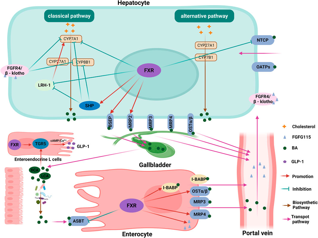 The underlying mechanisms of this dysregulation are complex and multifaceted. Mechanistically, during liver fibrosis progression in NASH mice, hepatocytes redirect BAs from biliary secretion to systemic circulation by regulating the expression of BA synthesis enzymes (CYP7A1) and transporter (BSEP, NTCP and OSTβ), leading to increased systemic BA concentrations (Suga et al., 2019). Furthermore, inflammation-induced downregulation of BA transporters further impairs enterohepatic circulation, exacerbating hepatic and serum BA accumulation (Hylemon et al., 2021). Additionally, an increased ratio of FXR-antagonistic DCA to FXR-agonistic CDCA suppresses the FXR-FGFR4 signaling pathway manifesting as CYP7A1 upregulation, NTCP reduction and decreased fibroblast growth factor 19 (FGF19) levels (Jiao et al., 2018). This creates a self-perpetuating cycle of BA accumulation and signaling failure, ultimately driving NAFLD progression. Therefore, targeting BA metabolism represents a promising therapeutic strategy.