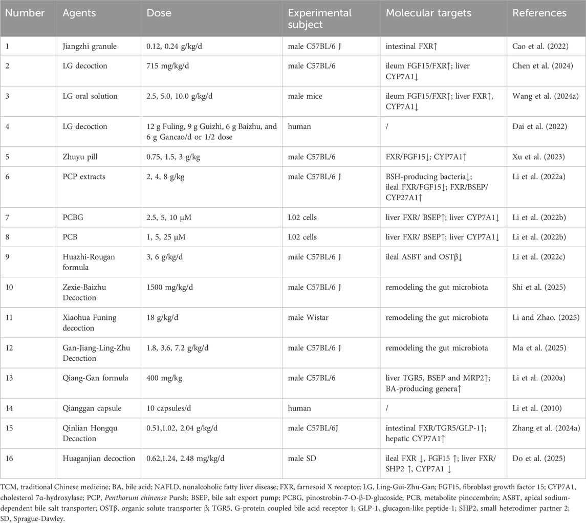 A prominent therapeutic strategy involves the activation of intestinal FXR/FGF15 signaling to suppress hepatic BA synthesis. For instance, the Jiangzhi granule ameliorated NASH in mice by activating intestinal FXR to increase secondary BAs and strengthen gut barrier integrity (Cao et al., 2022). Similarly, Ling-Gui-Zhu-Gan (LG) decoction mitigated BA dysregulation in NAFLD mice through coordinated ileal FXR/FGF15 activation and hepatic CYP7A1 suppression (Chen et al., 2024), a finding supported by work on LG oral solution (Wang et al., 2024a). This approach was further supported by a trial where low-dose LG decoction with lifestyle therapy improved insulin resistance in mildly overweight NAFLD patients (Dai et al., 2022). However, these studies were largely confined to mouse models, lacked clinical validation, and did not investigate the specific molecular targets or active metabolites.