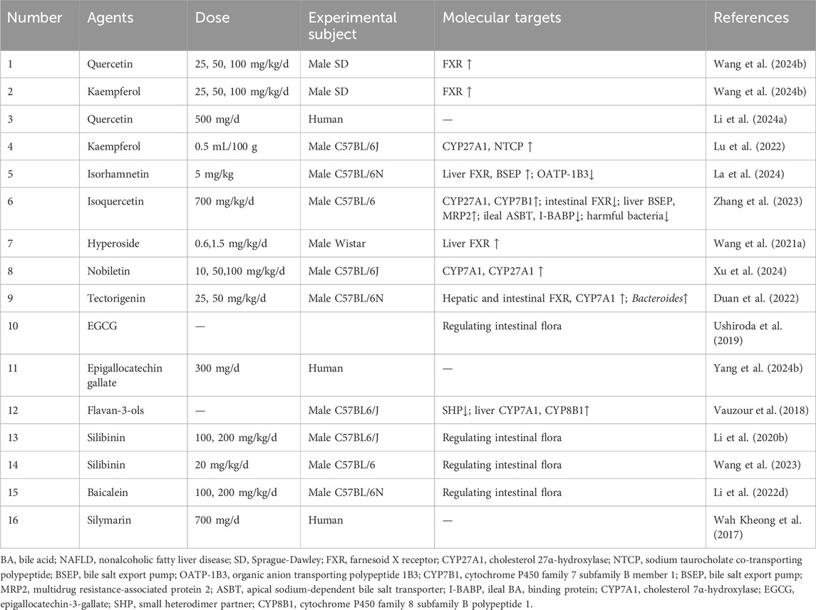 Quercetin, a prototypical flavonoid, was found to ameliorate NAFLD by activating FXR to regulate lipid metabolism, restore liver function, suppress inflammation, and mitigate oxidative stress (Wang et al., 2024b). However, the high-fat diet (HFD)/lipopolysaccharide rat model is a poor analog for human NAFLD, as it induces acute, exogenous inflammation rather than the chronic, metabolic condition and omits the critical gut-liver axis. A 12-week randomized, double-blind, placebo-controlled trial demonstrated that daily supplementation with 500 mg of quercetin moderately reduced intrahepatic lipid content in patients with NAFLD, accompanied by slight decreases in body weight and BMI, and the intervention showed good safety (Li et al., 2024a). Nevertheless, the trial is limited by its small sample size and a lack of long-term follow-up to assess the durability of effects and potential for delayed adverse events. In addition, while sharing FXR-dependent lipid modulation with quercetin (Wang et al., 2024b), kaempferol enhanced BA transport via upregulation of CYP27A1 and NTCP to adjust BA metabolism, suggesting potential efficacy against NASH progression (Lu et al., 2022). However, relying solely on male mice, while methodologically convenient, constitutes a flawed design that inappropriately generalizes male pathology to a diverse patient population. Building on quercetin’s framework, its metabolite isorhamnetin alleviated cholestasis and decelerated NAFLD progression by upregulating FXR-mediated BSEP to promote canalicular BA excretion, while OATP-1B3 suppression reduced sinusoidal reuptake, collectively shifting BA flux toward intestinal elimination to alleviate hepatic BA overload (La et al., 2024). Furthermore, the glycosylated derivative isoquercetin restored enterohepatic BA homeostasis not merely by mimicking quercetin but through selective pathway activation: it upregulated CYP27A1 and CYP7B1 without affecting CYP7A1/CYP8B1, inhibited intestinal FXR (not hepatic FXR), enhanced hepatic efflux transporters (BSEP/MRP2) and inhibited ileal reabsorption proteins (ASBT/I-BABP), while concurrently suppressing harmful gut bacteria (Zhang et al., 2023). The tissue specific FXR modulation, namely, activation by quercetin/isorhamnetin in the liver and inhibition by isoquercitrin in the gut, highlights a fragmented mechanistic landscape where the structural determinants of this selectivity are poorly defined, which in turn is a major barrier to the rational design of targeted NAFLD therapeutics.