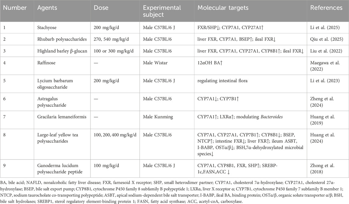 Beyond direct FXR modulation, many saccharides achieved their therapeutic effects indirectly by remodeling the gut microbiota, which in turn influenced BA metabolism. Raffinose reduced hepatic and systemic 12αOH BA levels yet did not lower cecal secondary 12αOH BA or transaminases, indicating its primary role in suppressing enterohepatic 12αOH BA recirculation to alleviate hepatic lipidosis (Maegawa et al., 2022). However, the model was limited to exogenous BA overload, omitting critical factors like obesity and insulin resistance. Lycium barbarum polysaccharide specifically regulated lipid metabolism to ameliorate hepatic steatosis (Xia et al., 2022), whereas its oligosaccharide counterparts appeared to function indirectly, as their steatosis reversal correlated with gut microbiota remodeling and BA metabolism modulation, suggesting gut-liver axis mediation (Li et al., 2023). The research on this astragalus polysaccharide took the regulation of intestinal flora as the core mechanism but failed to verify its causality through experiments such as FMT. Astragalus polysaccharide modulated BA metabolism, specifically by increasing the beneficial THDCA, which in turn downregulating CYP7A1 and regulating CYP7B1 to reduce hepatic fat accumulation (Zheng et al., 2024). Although this study clearly demonstrated that astragalus polysaccharides improved NAFLD by increasing THDCA, it did not verify whether the observed increase in THDCA levels was dependent on the prebiotic-like remodeling effect of the polysaccharides on the intestinal flora. Similarly, gracilaria lemaneiformis upregulated liver X receptor α (LXRα)/CYP7A1 and modulated bacteroides, demonstrating lipid-lowering and BA-conversion dual efficacy (Huang et al., 2019). The study was limited by the neglect of functional disparities in bacteroides between humans and mice and the unknown impurities remaining undefined.